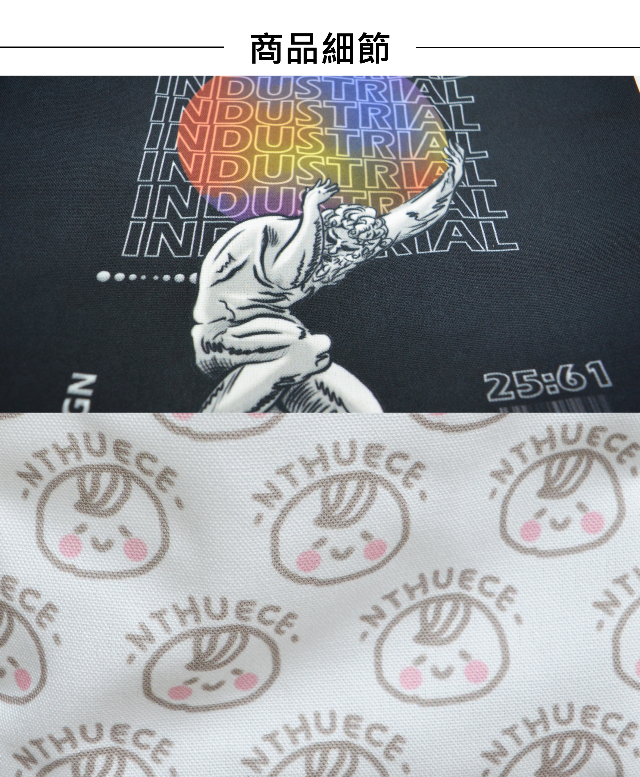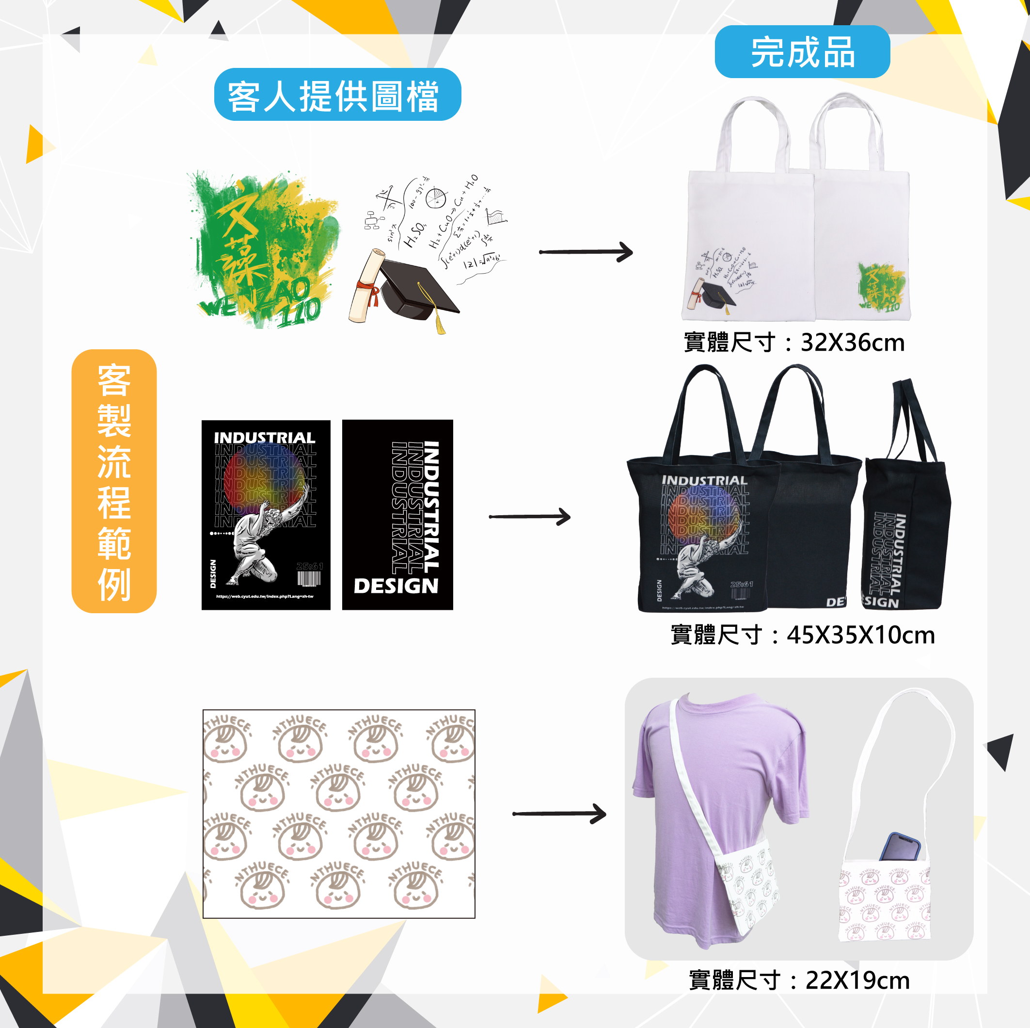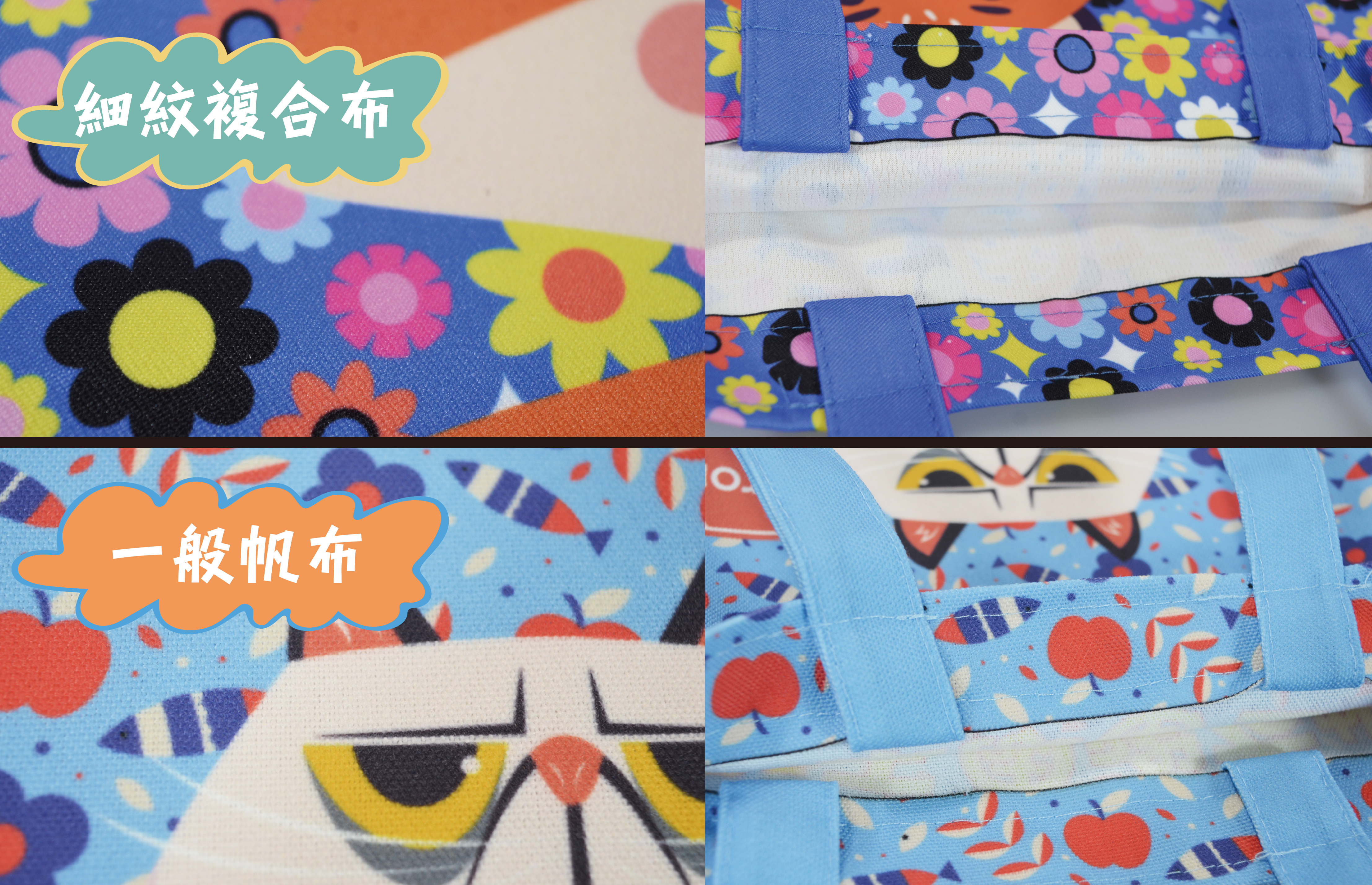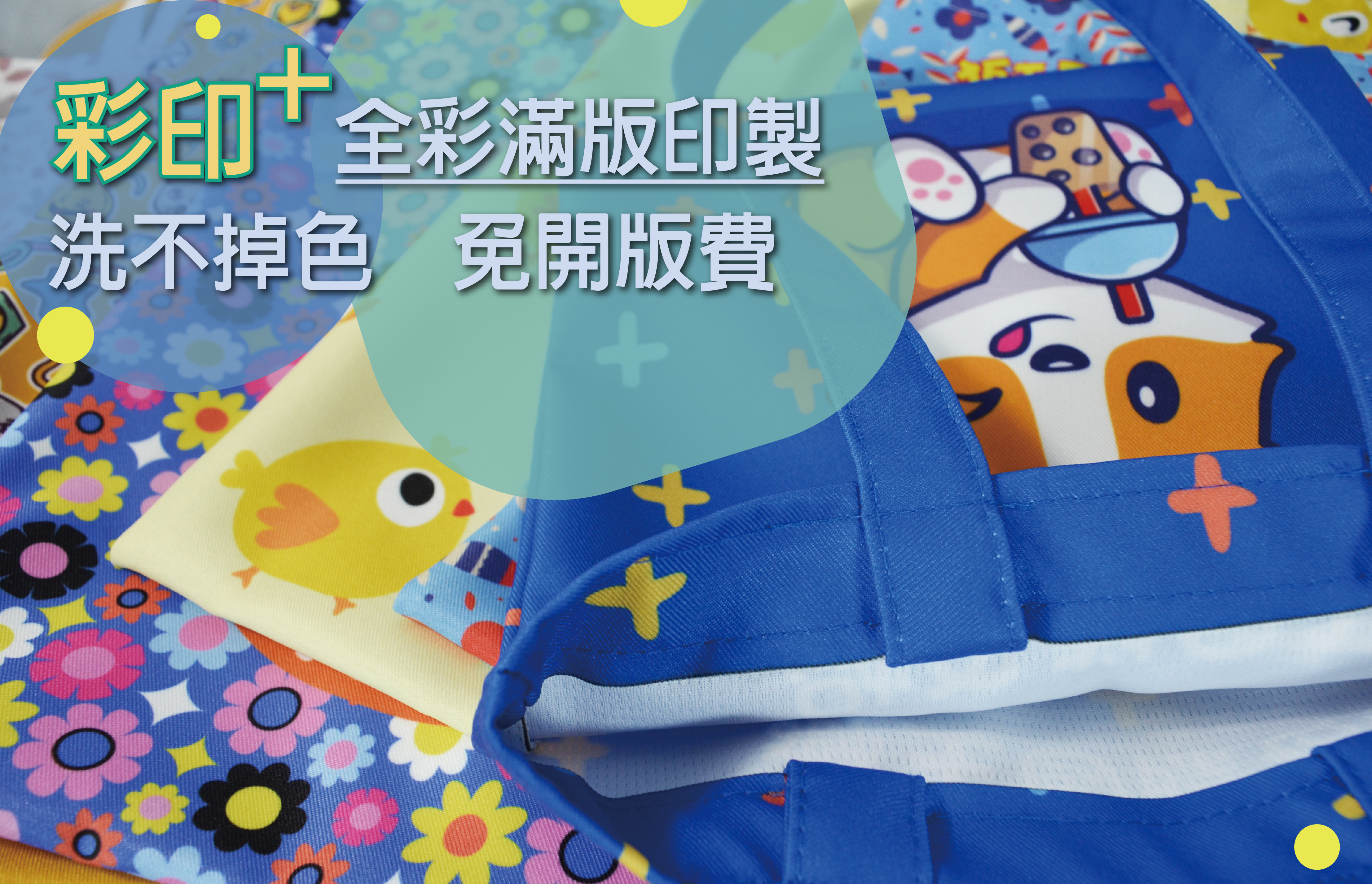 除了可滿版客製化印刷之外,不限顏色、而且免版費!帆布昇華轉印後經雷射切割,再由我們針車人員縫製完成。