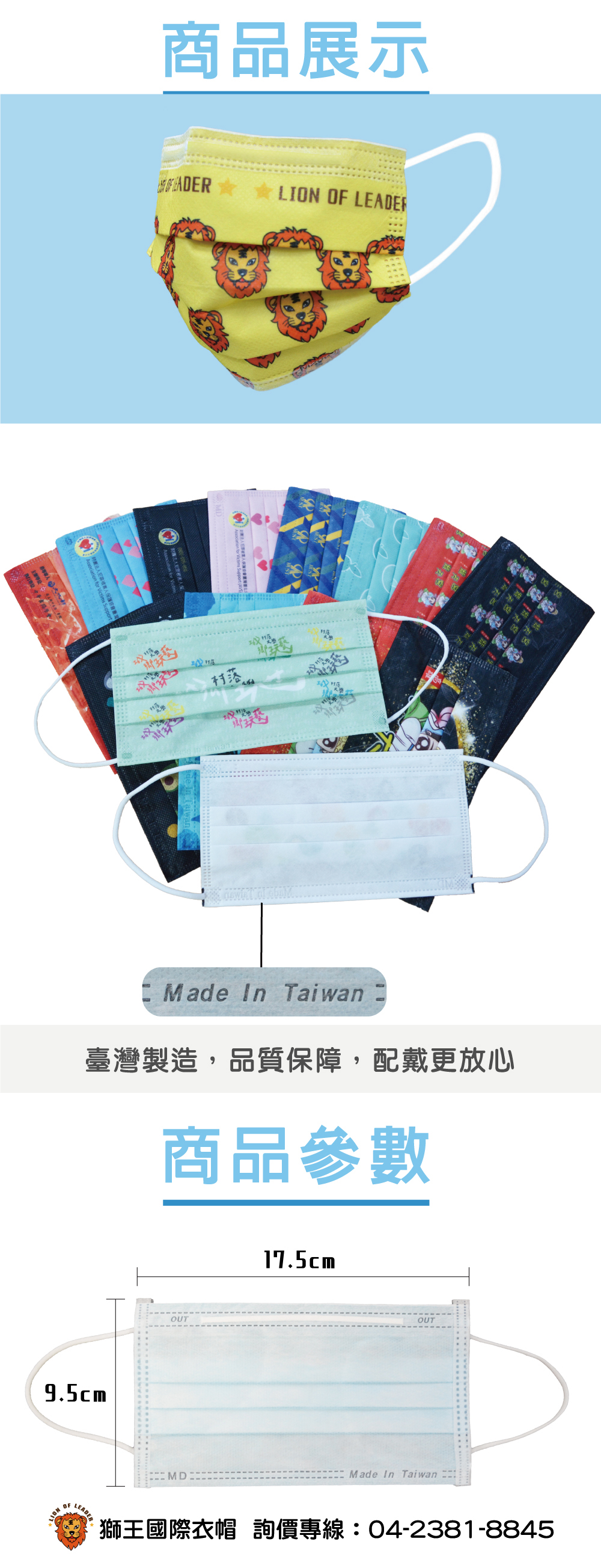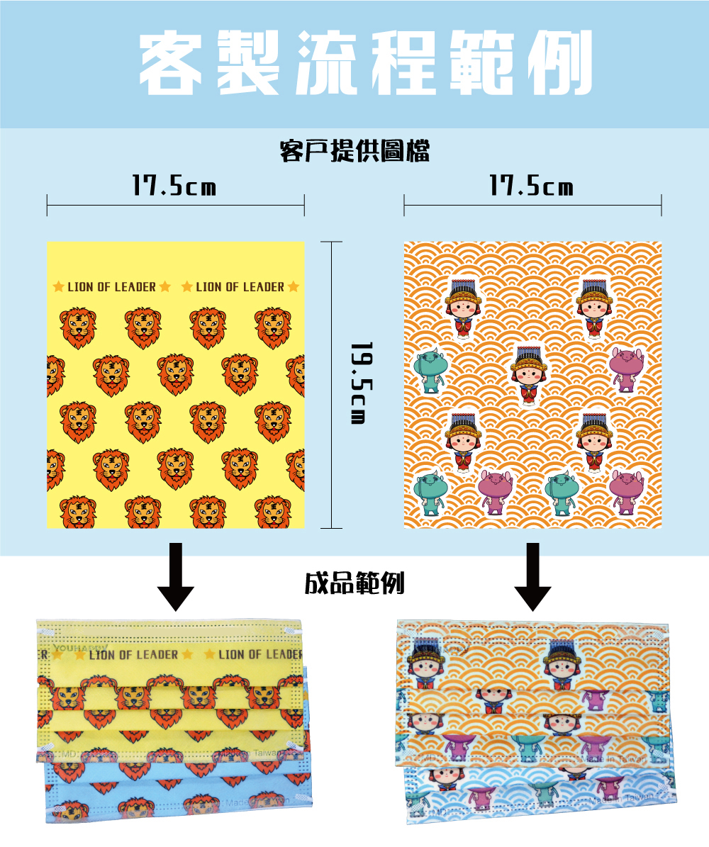 感謝政府單位.學校.企業.活動公司,指定獅王客製化口罩 快速交貨,工廠直營,合格檢驗,配合放心。 提供專業客製醫療口罩服務,滿版定位/亂花都可做! 與政府立案合格醫療口罩廠合作,提供您最安心的客製化口罩。 魚口罩也有客製化唷!詳情點我! 聯繫方式 業務專員 點我加LINE 服務專線 04-23818845 Email 123@h1.com.tw 不織布代工印刷 廠商端可聯繫開發部-陳小姐 聯繫方式 業務專員 點我加LINE 服務專線 04-23818845 Email 123@h1.com.tw 不織布代工印刷 廠商端可聯繫開發部-陳小姐 少量客製化口罩只要1000片即可製作! 客製化口罩(一般防護口罩/醫療型口罩) 口罩尺寸: 成人尺寸(17.5*9.5CM) 口罩材質: 外層防潑水PET不織布.熔噴不織布(Melt-blown) 口罩印刷: 採用熱昇華印刷 口罩包裝:可獨立包裝、50入一盒、紙盒設計等包裝方式請直接洽詢 販賣業藥商證號: 中市藥販 字第 6203245896號 #口罩訂製 #客製化口罩 #企業口罩 #客製醫療口罩