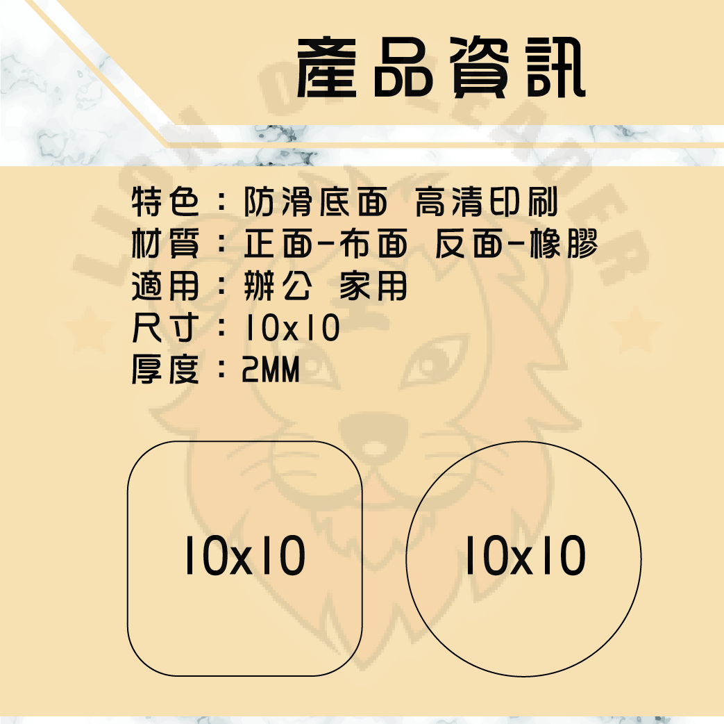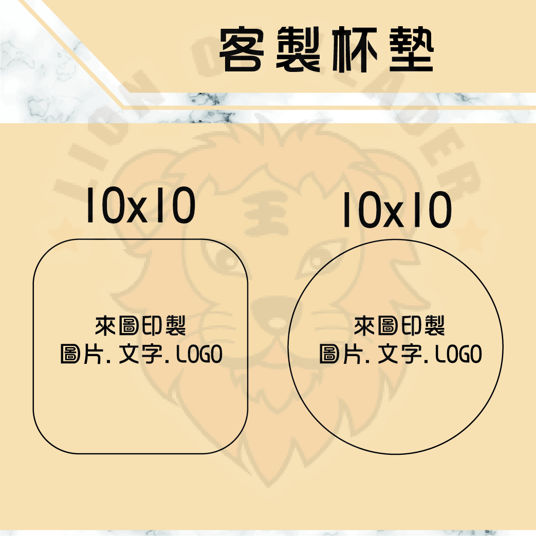 客製化杯墊規格 尺寸: 10*10cm (可選正方形、圓形) 最低訂購量: 10個 厚度: 2mm 點我查看更多滑鼠墊.杯墊 訂購方式如下 來電詢價 04-2381-8845 LINE@線上詢價【@oom6205d】 當天快速報價 我們盡速提供報價、交貨日期 收到訂金後安排製作 量產出貨 確認尺寸、製作細節後開始量產製作 餘額出貨付款或自取